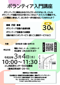ボランティアに興味はあるけれどきっかけがない方、どんなボランティア活動があるか知りたい方などへ向けて、入門講座を実施します。