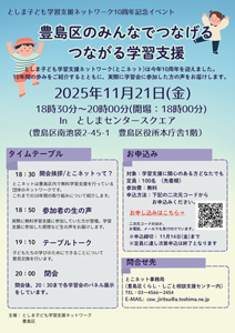 としま子ども学習支援ネットワーク(とこネット)は豊島区内で無料学習支援を行っている団体のネットワークで、今年10周年を迎えます。10年間の歩みをご紹介するとともに、実際に学習会に参加した方の声をお届けします。