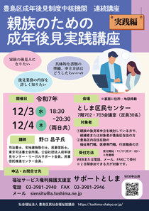 | 対 象 | ①候補者または対象者が豊島区在住の親族の後見等申立をお考えで自らが候補者となる予定の方 ②現在親族の後見人等に就任している方 ③豊島区内に在勤の福祉・医療専門職 |